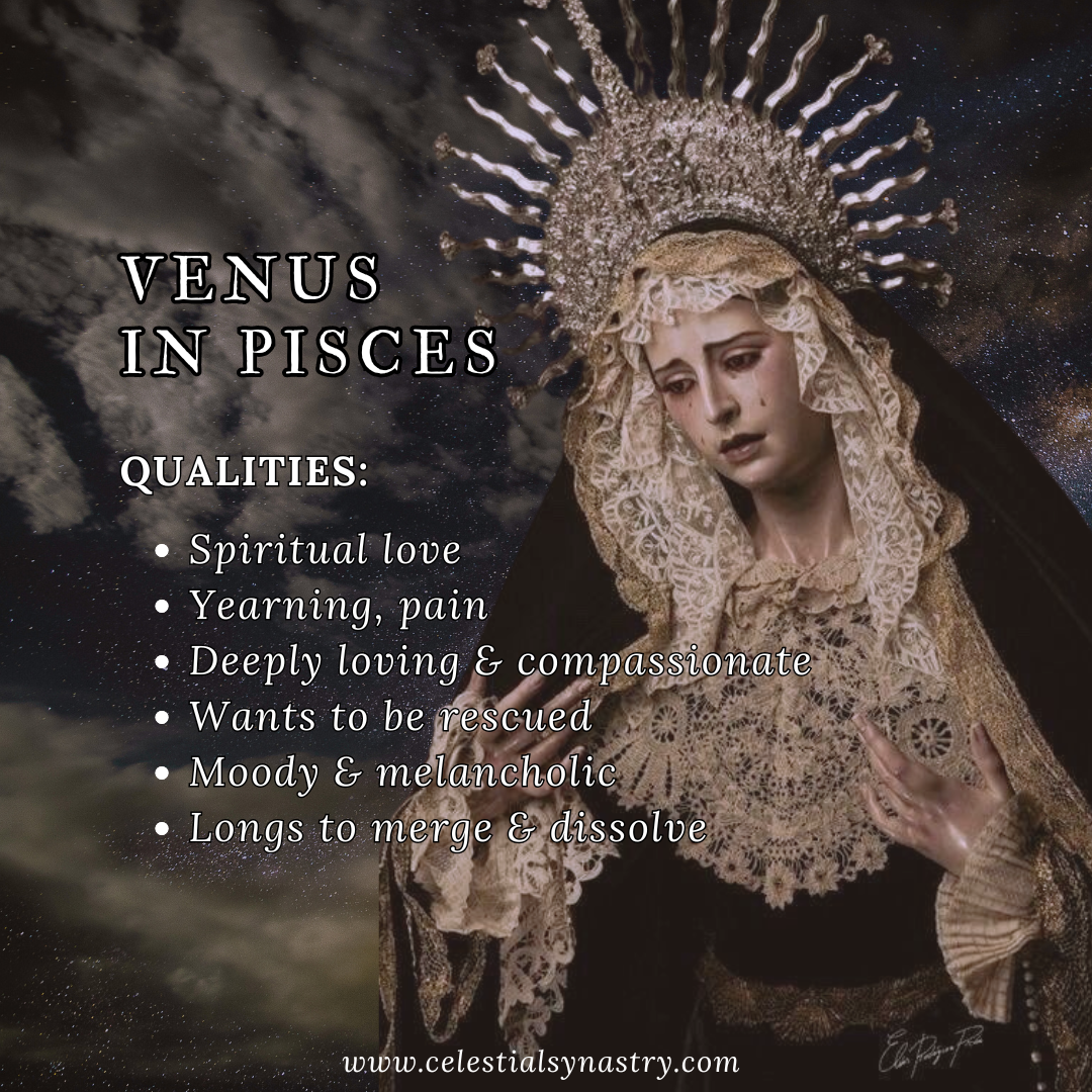 And that’s really what it is. Venus in Pisces (or harshly aspected by Neptune) idealizes everything they love - and they do not discriminate. Their loved ones can do no wrong to them in their eyes, and they will put up with endless amounts of abuse, rejection and indignity in the name of love. It’s easy for them to just ignore red flags and warning signs, even when they’re lined up and staring them in the face. The way they see it, these small human failings don’t matter. They pale in significance next to the vastness of love they feel and share for those they care for. It doesn’t matter how bad that person may be for them, or how unavailable. Heartbreak is perhaps Venus in Pisces’ most commonly felt emotion, next to infatuation; and these emotions may often be felt by Venus in Pisces at the same time, for the same person.