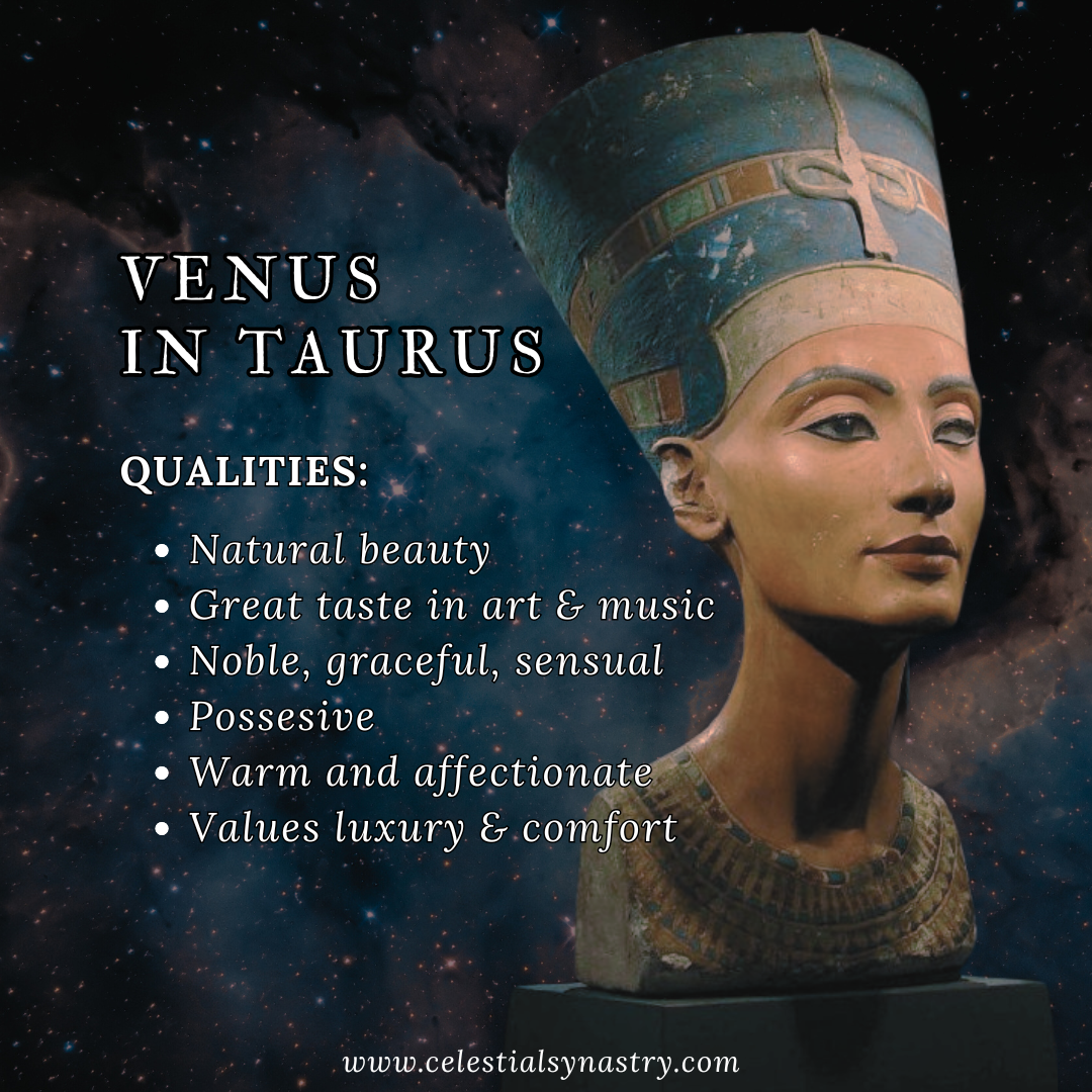 When everything is right, Venus in Taurus expresses love and affection in a measured, steady and tangible way - but when they're struggling, they do have a tendency to withdraw emotionally and become distant. Since they value stability so much, they don't always like to relenquish control to someone else in a relationship dynamic, especially if they feel they cannot trust the other person to protect their interests. They sometimes struggle to allow themselves to be truly 'known' by others. However, when Venus in Taurus feels secure and safe, they can be incredibly generous, loving, endlessly caring and patient, with all of the tenacity that Taurus is so notable for.